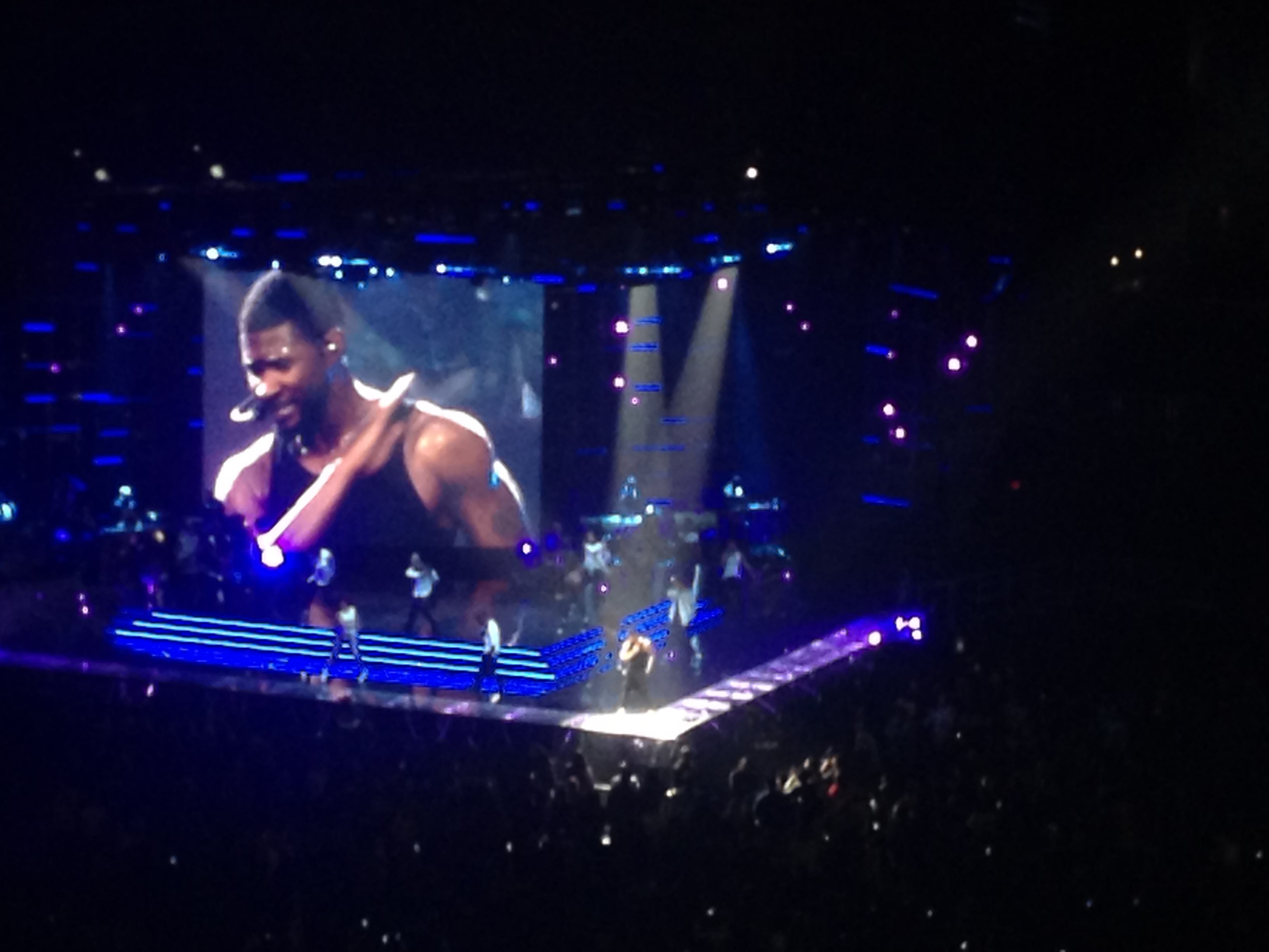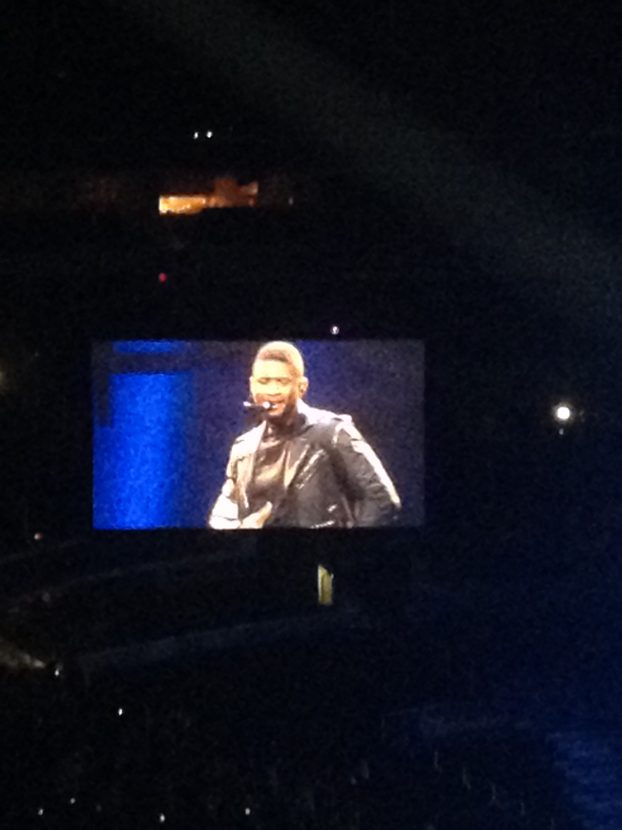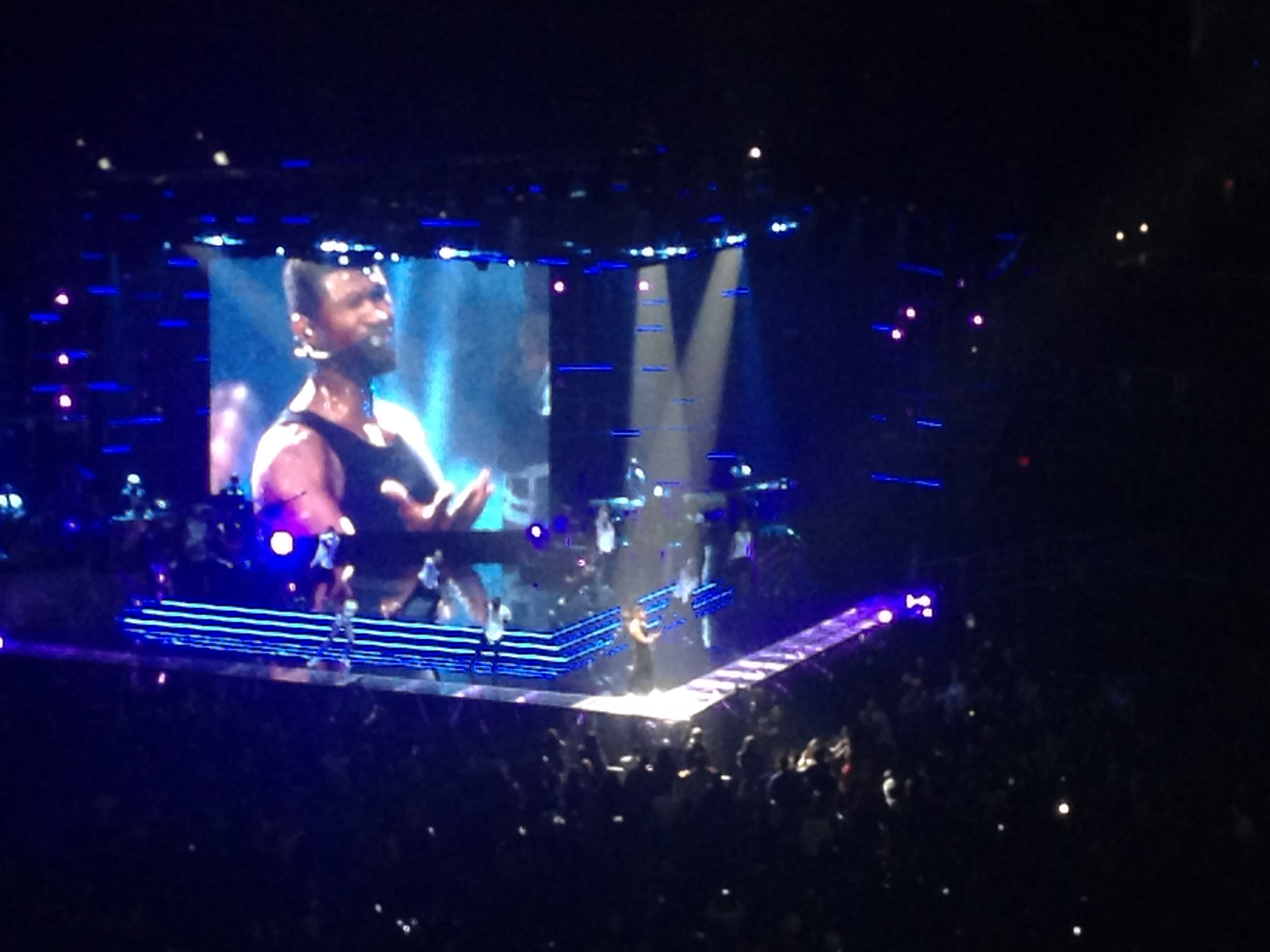 We missed the first couple opening acts, but who cares. We had no idea who they were anyway. Concert started at 7:30, Usher went on at 9:05ish. We got there with perfect timing. I will tell you, I have become SUPER spoiled for the rest of my life when it comes to sporting events & concerts. Many of them, due to my job, mean I get to hang out in a suite with lots of space. (Unless we go to Justin Timberlake in FABULOUS seats, but even then, some obnoxious asshat drunk may throw up on your seats… another story for another day).