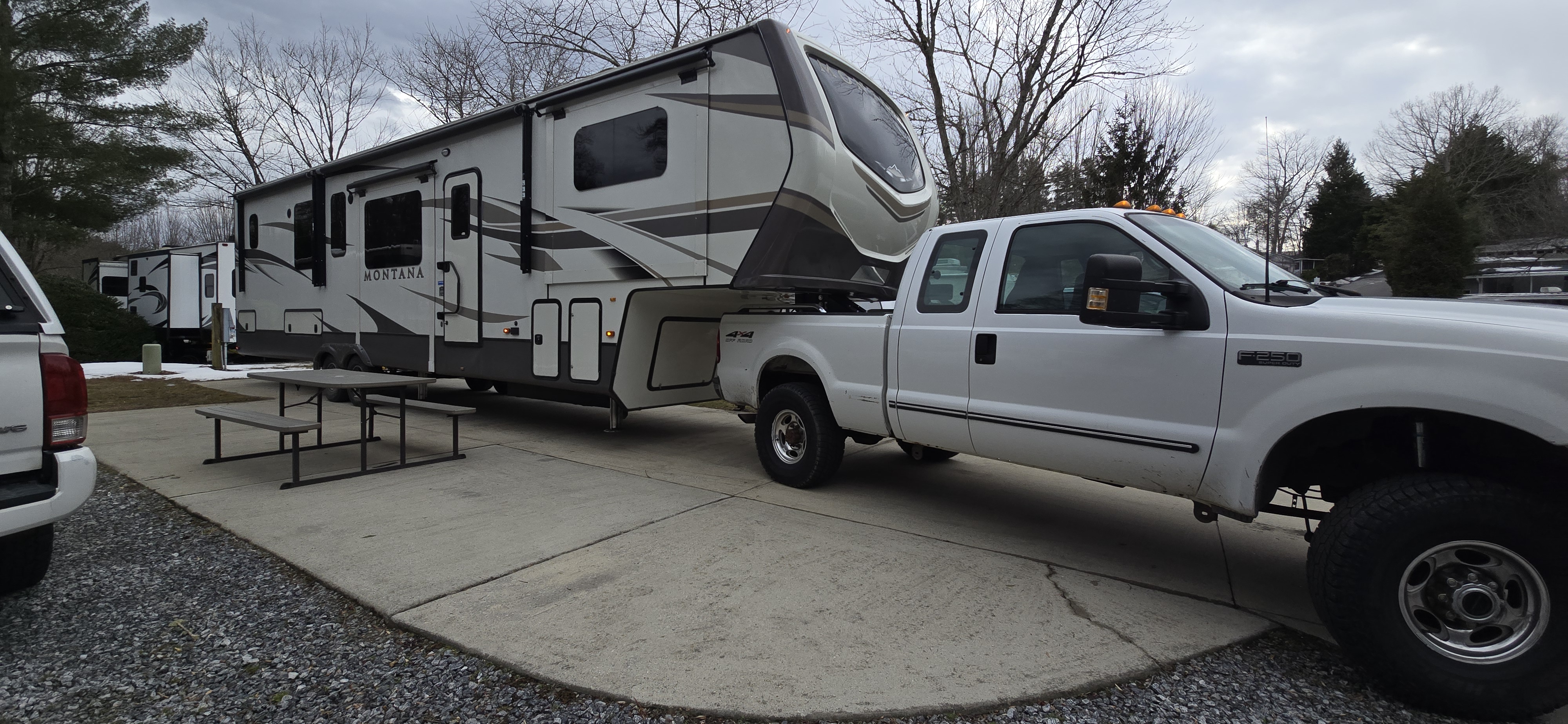 So we packed up our house, put the essentials in our pre-loved 2020 41ft Keystone Montana 3761FL 5th wheel and this is our new home while we search for the perfect plot of land to build our dream house on.